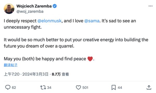 就在几天前,参与此次署名的 OpenAI 联合创始人之一 Zaremba 在 X 上公开表示,“我非常尊敬 elon,也非常喜欢 sama。看到无谓的争吵令人难过。与其争吵,不如把你们的创造力投入到建设你们梦想的未来中去。”
