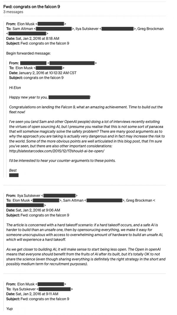 埃隆明白,这项任务并不意味着开源 AGI。正如伊利亚(Ilya Sutskever)告诉埃隆的那样“随着我们越来越接近构建人工智能,开始降低开放程度是有意义的。OpenAI 中的‘open’是指人工智能建成后,每个人都应从人工智能的成果中受益,但不分享科学成果也完全没问题......”,埃隆回答道:“是的”。