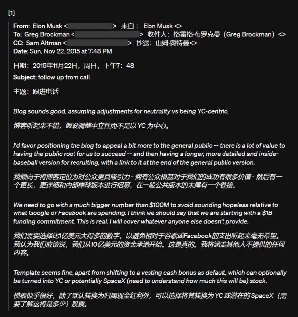 自 2015 年底启动 OpenAI 以来,Greg 和 Sam 本来打算筹集 1 亿美元。Elon 在一封邮件中建议:“我们需要提出一个远超 1 亿美元的数字,以免显得无望……我认为我们应该宣布,我们的起步资金承诺为 10 亿美元……我将补足其他人未能提供的部分。”