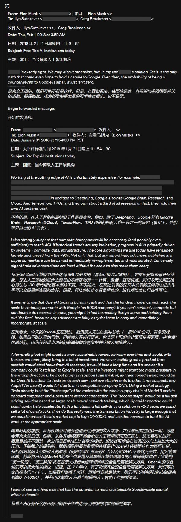 2018 年 2 月初,Elon 转发了一封电子邮件给我们,建议 OpenAI 应该“成为Tesla的资金来源”,他评论说这是“绝对正确的……在对抗 Google 方面,Tesla 是唯一有希望的路径。即便如此,成为 Google 对手的概率也很小,但并非零。”
