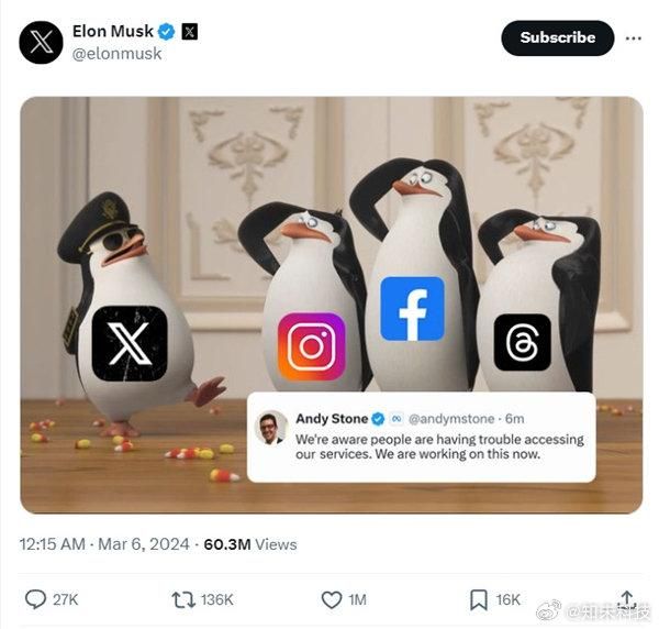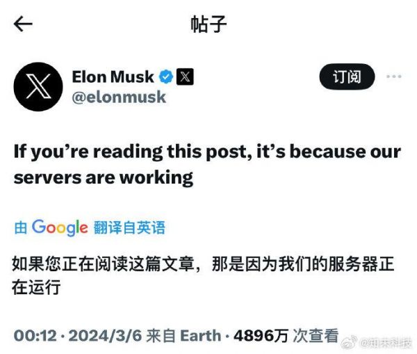 Meta公司旗下的Facebook和Instagram全球死机,老马直接段子手上身:“如果你正在阅读这条内容,那是因为我们的服务器在正常运转”。甚至他还火上浇油,发布一张网友自制的GIF动图,图中还包含了Meta高管用X回应的的帖子。