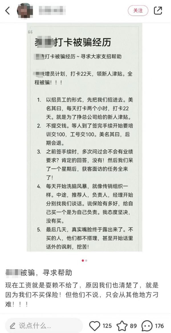 在各种社交平台,有关参加保险公司培训、兼职听课被骗的帖子和笔记屡见不鲜。