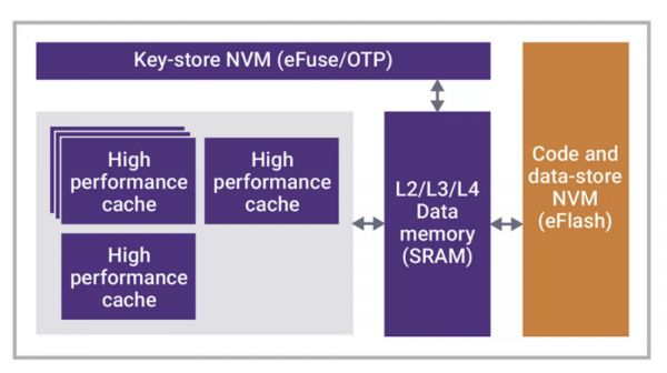 代码和数据存储存储器:高容量NVM存储启动代码、固件和数据。随着 AI/ML、IoT 和自动化的进步,存储器容量也在不断增加,而功耗也变得至关重要。以前,嵌入式闪存(eFlash)是实现这一目的的唯一选择。