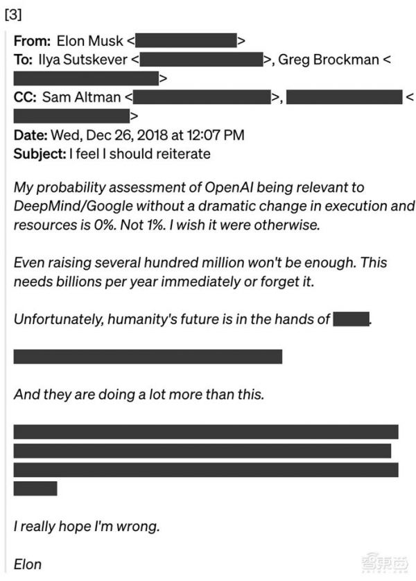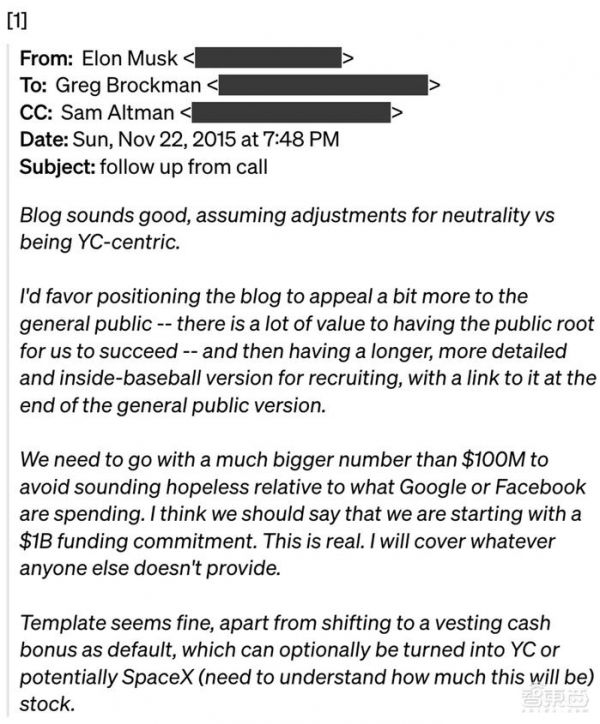 2015年底创办OpenAI时,Greg和Sam最初计划筹集1亿美元。Elon在一封电子邮件中写道:“我们需要比1亿美元更多的资金,以避免听起来毫无希望……我认为我们应该说,我们将从10亿美元的融资承诺开始……我将承担其他人没有提供的任何资金”。[1]