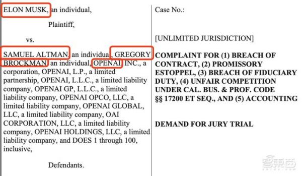 上周五,马斯克向旧金山高等法院提交46页诉讼文件,状告OpenAI CEO Sam Altman、总裁Greg Brockman以及OpenAI多个实体,痛斥OpenAI违背初衷,称自己被OpenAI骗钱骗人骗技术,并检举揭发了OpenAI五大“罪状”。