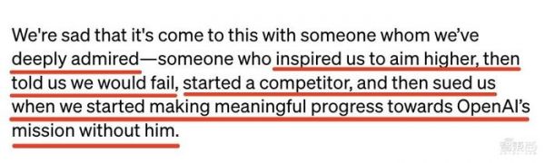 我们很遗憾,我们深深敬佩的人走到了这一步——他激励我们追求更高的目标,然后告诉我们我们会失败,创建了一个竞争对手,当我们在没有他的情况下开始朝着OpenAI的使命取得有意义的进展时,他起诉了我们。