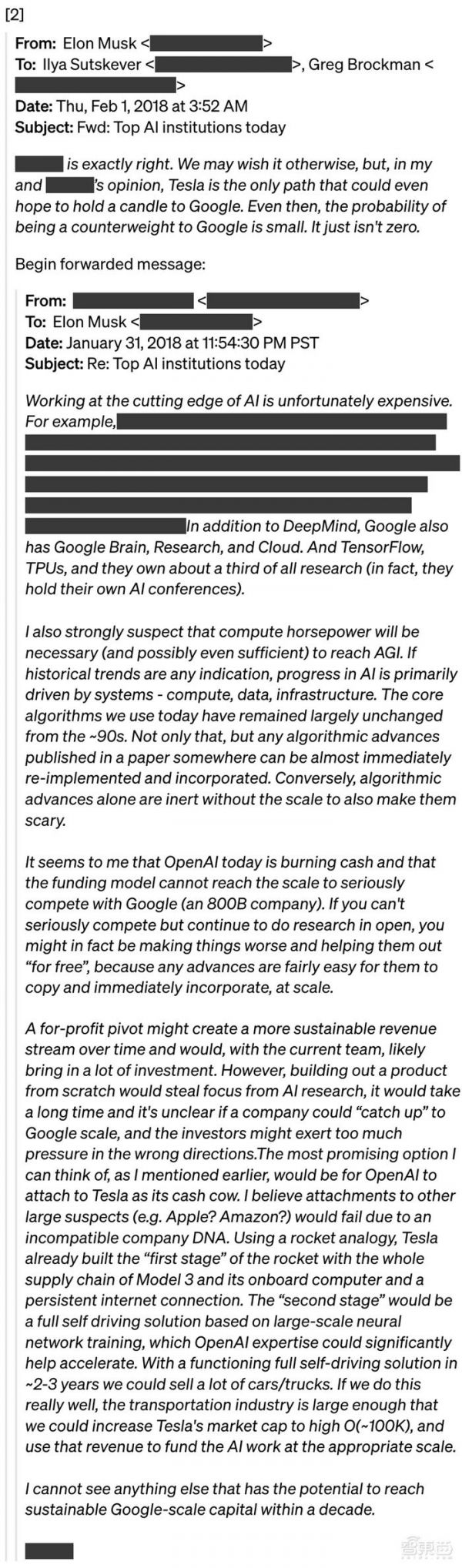 我们无法与Elon就营利性条款达成一致,因为我们认为任何个人对OpenAI拥有绝对控制权都是违背使命的。然后他建议将OpenAI并入特斯拉。2018年2月上旬,Elon向我们转发了一封电子邮件,建议OpenAI应该“将特斯拉当作它的摇钱树”,并评论说这是“完全正确的……特斯拉是唯一有希望与谷歌匹敌的道路”。即便如此,与谷歌抗衡的可能性也很小。它只是不为0”。[2]