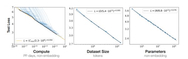 2020年,来自OpenAI的Kaplan等人的团队,在Scaling Laws for Neural Language Models论文中首次提出模拟神经语言模型的模型性能(Loss)与模型大小 、数据集大小和训练计算量的关系。该团队发现三者中任何一个因素受限时,Loss与其之间存在幂律关系。