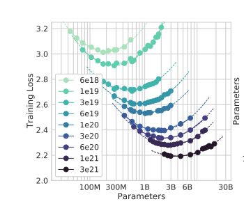 Figure 5. 给定不同的FLOP预算(不同颜色),训练损失和模型参数量的关系