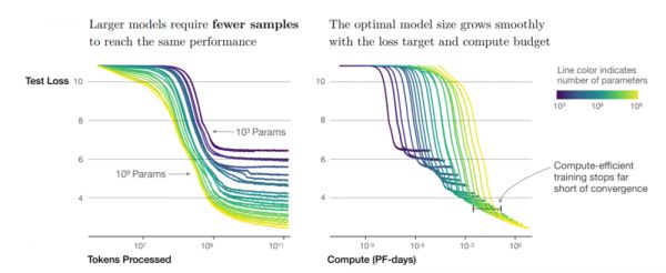 在固定算力预算下进行训练时,最佳性能可以通过训练参数量非常大的模型,并在远离收敛前停止(Early Stopping)来实现。