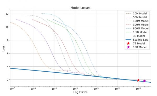 Figure 6. Baichuan2的缩放定律:使用1万亿个token训练了从1000万到30亿参数不等的7个模型,对给定训练浮点运算次数(FLOPs)时的训练损失进行幂律拟合(蓝线),从而预测了在2.6万亿token上训练Baichuan2-7B和Baichaun2-13B的损失。拟合过程精确预测了最终模型的损失(两颗星标记)