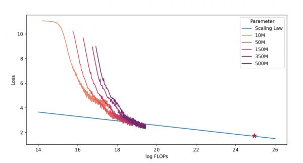 两者在真正着手训练数十亿或者百亿参数的大语言模型之前,训练多个小型模型为训练更大的模型拟合拓展规律。具体做法是在同一套(足够大)的训练集上,采用一致的超参数设置,独立训练每个模型,收集训练的计算量和最终损失。而后以OpenAI论文中结论的幂律关系拟合,预测出期望参数量模型的训练损失。