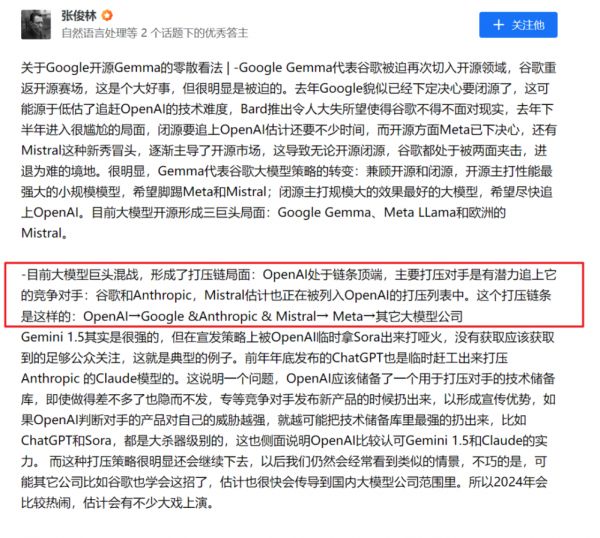 这种情况被张俊林大佬在总结为“打压链理论”。具体而言,在目前整个大模型领域 OpenAI 变成了毫无疑问的“行业老大”,位处链条的最顶端,占据先发优势的 OpenAI “有能力打压有潜力追上它的竞争对手”,比如谷歌,再比如 Anthropic。