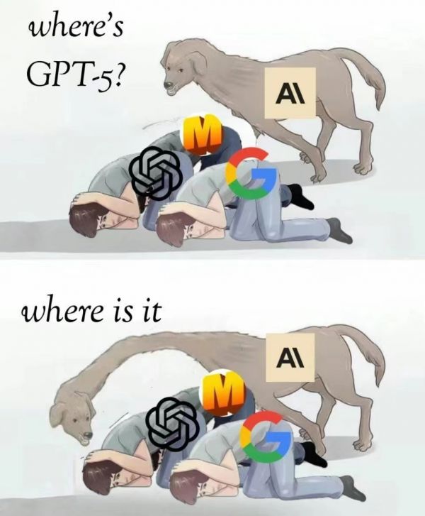 这种策略我们可以在 OpenAI 推出 ChatGPT 打压 Claude 时看到,也可以在今年 Sora 打压 Gemini 时看到,并且在社区内,大家甚至也在期待看到 GPT-5 打压 Claude 3 的时刻。不过 24 个小时过去,GPT-5 的王炸暂时还没有出现,这个“where is GPT-5”的表情包也迎来了进化: