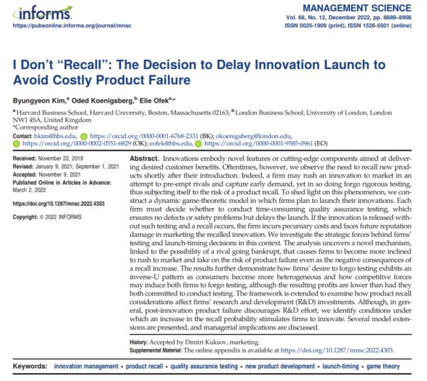 在管理学的顶级期刊Management Science的论文I Don’t “Recall”: The Decision to Delay Innovation Launch to Avoid Costly Product Failure中,来自哈佛商学院的团队设置了这样一个场景: