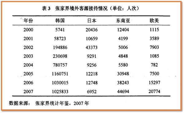 此后,张家界的韩国游客越来越多。2005年,116万人次来张家界旅游。这一年,韩国的出境游客人次是1008万,访华人数突破350万,首次成为中国第一大入境客源国。也就是说,每三个出国游玩的韩国人,就有一个来的是中国,每三个来中国玩的,就有一个去张家界。