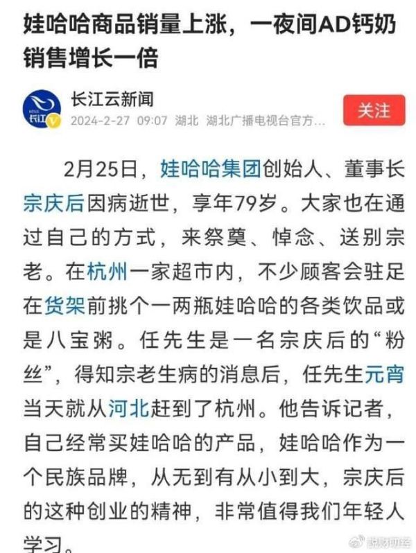 互联网的各大网站,充满了悼念、缅怀的氛围,娃哈哈的产品也因此而销量大涨,与之形成两极分化的,则是农夫山泉的销量、股价双跌。