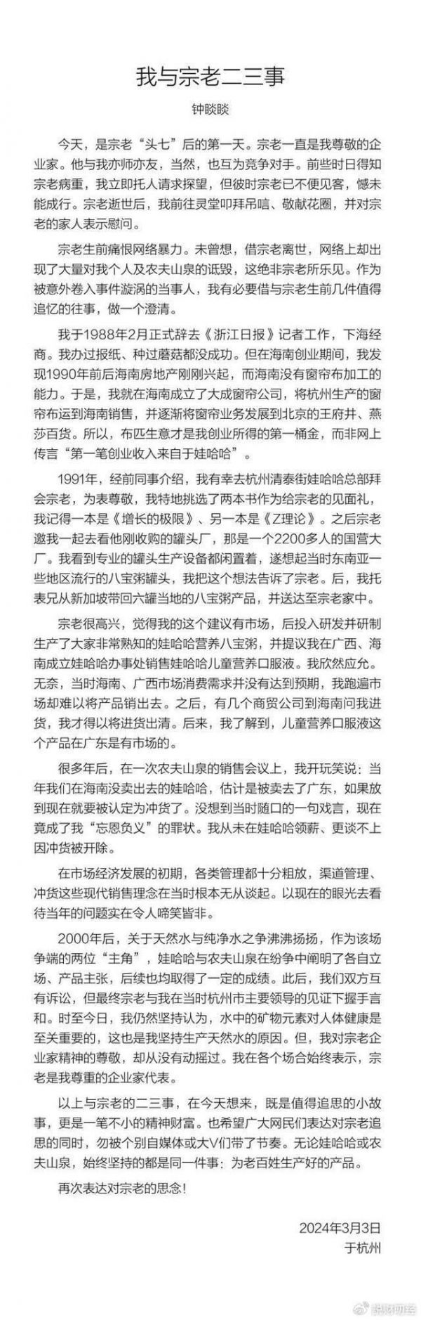 娃哈哈的创始人2月25日去世,网上的悼念活动、缅怀声音不绝于耳,紧接着喜欢搞事情的网民也挖出了一些当年的陈年旧事,其中就有矛头直指农夫山泉创始人——钟睒睒的一些“莫须有”的“黑料”,大意就是说钟首富当年在娃哈哈任职,受到了娃哈哈创始人宗庆后的提携,赚到了第一桶金,然后才创建了农夫山泉。但是,钟首富之所以“青出于蓝而胜于蓝”,实是不厚道的选择了反戈一击,利用在娃哈哈任职时的资源、人脉,回过头来抢了娃哈哈的生意,于是才有日后扶摇直上的暴富之路,一路坐上了首富的位置。