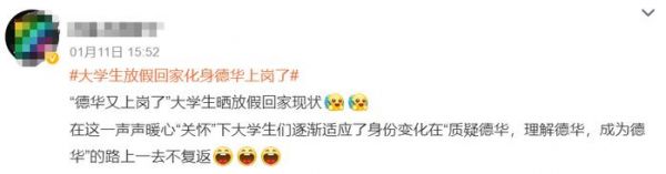 随着大学生德华的增多,社交媒体上产生了#德华带娃#的讨论话题,也有人表示疑惑#大学生怎么成了德华#?还产生了#大学生放假回家化身德华上岗了#、#大学生德华是玩梗也是认同#等诸多话题,同时德华表情包也横空出世。