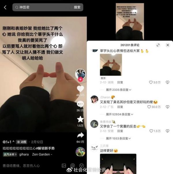与表姐吵架后,想要向她求和,于是比了两个心,原本以为会得到谅解,没想到的是,竟得到了表姐戏剧性的回复”你给我比个草字头干什么“,随后网友将这一经历分享到了短视频平台上,而被众多网友围观。