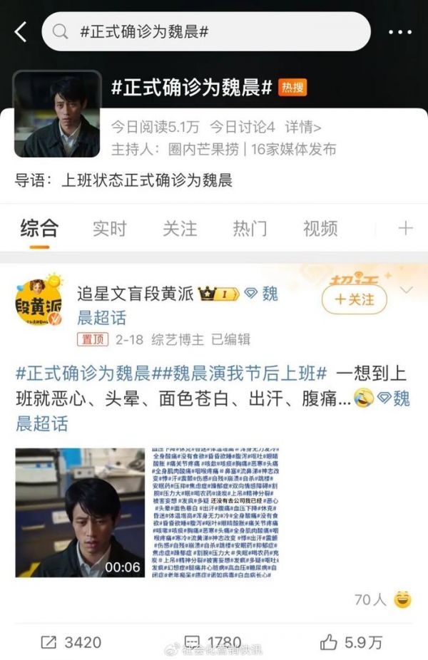 同样是预示着假期结束,还有一个热梗是正式确诊为魏晨,被视为是“正式确诊为XX”的假期升级版。