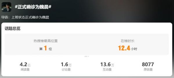 目前,#正式确诊为魏晨#的微博话题已经累计产生了4.2亿阅读量,此数据还在持续攀升中。
