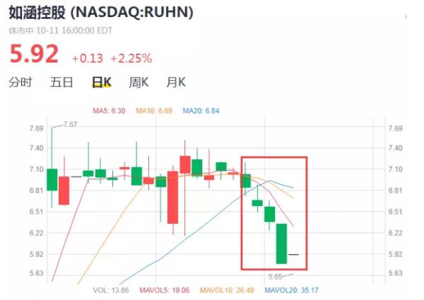 每日经济新闻(微信号:nbdnews)记者注意到,本周如涵控股曾连续4个交易日下跌,其中周四收跌9.11%,不过,周五如涵控股收涨2.25%,小幅回血,目前总市值4.9亿美元。