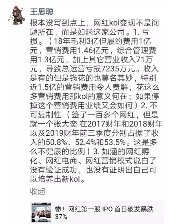 如涵上市不到一周后,王思聪也在朋友圈分析了如涵的业务模式。他称如涵所存在的三大问题包括:首先是因营销费用占比过高等所造成的亏损;其次则是网红具有不可复制性;最重要的是如涵的模式“说白了没有验证成功,也没有证明出自己可以培养出新KOL”。