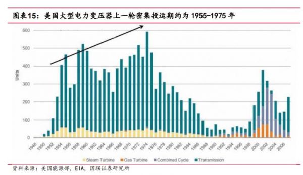变压器需求的暴涨主要源自2方面,一是新能源推动美国大型发电项目装机增长,二是当前正值上一轮美国变压器投运高峰的换代周期。