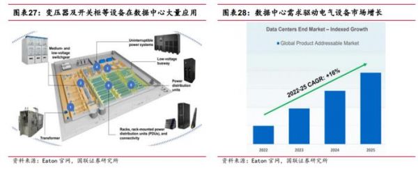 国联证券表示,生成式AI等计算负载驱动数据中心功率密度大幅增加,也提升了对相应电力设备的数量和性能要求。变压器和开关柜等电力设备在数据中心中大量应用,据Eaton预测,数据中心驱动的电气设备市场空间有望在2022-2025年以16%的年华增长。