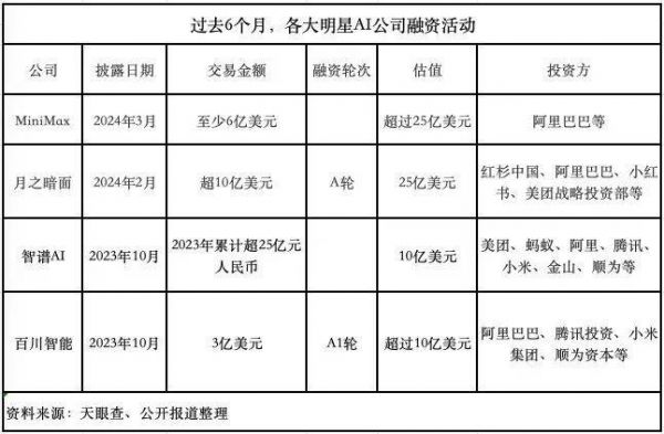 当前,阿里巴巴、腾讯、美团等互联网大公司正在围猎AI明星初创公司。《中国企业家》统计,在过去6个月,大公司联合风险投资机构向AI行业大概投出去了23亿美元(约合165亿元人民币),这些钱主要流向月之暗面、智谱AI、百川智能以及MiniMax等明星AI公司。