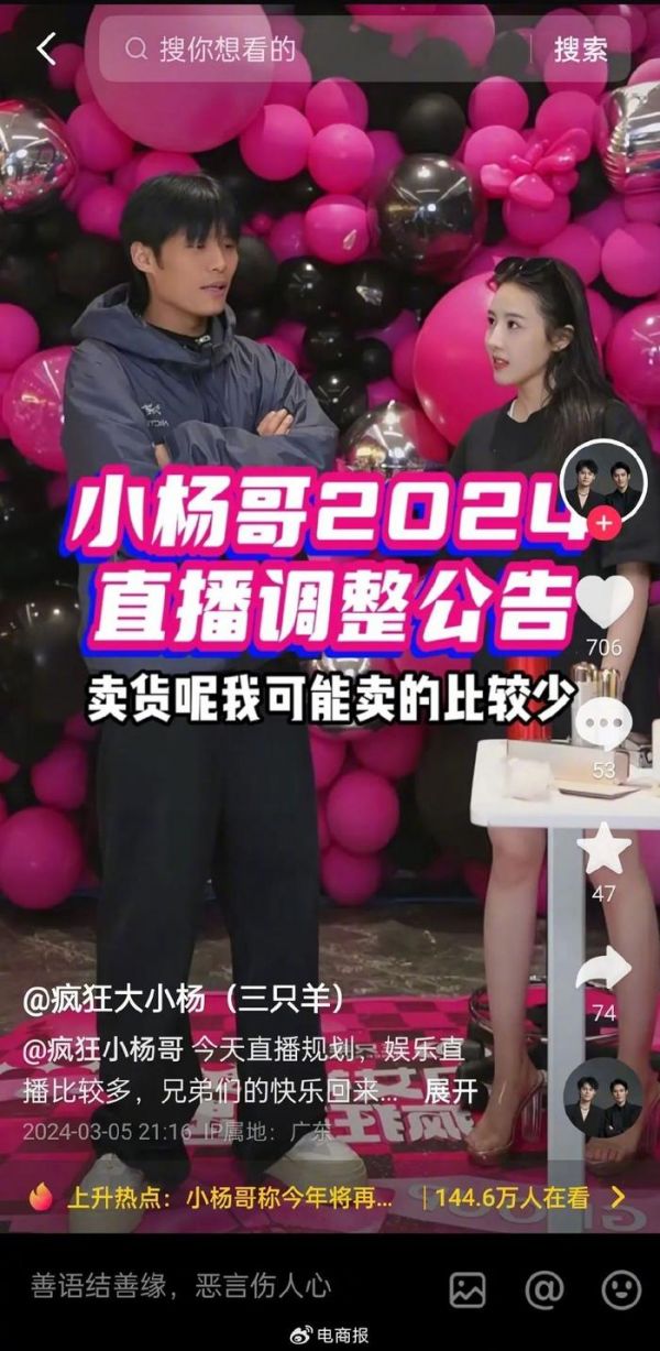 3月5日晚,小杨哥在直播中表示,2024年娱乐直播会比较多,将减少直播带货场次。同时表示,如果有专场活动,考虑将自己过亿粉丝的账号直接交由徒弟使用。