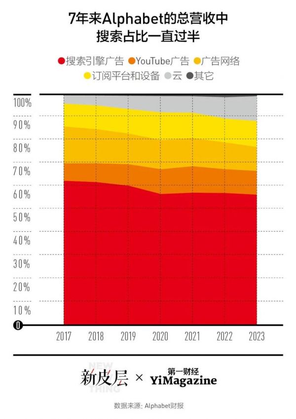 Statcounter Global Stats的数据显示,截至2023年,全球搜索引擎市场的规模已经超过1000亿美元。虽然Alphabet的搜索引擎免费,但通过付费广告,其搜索引擎业务(Google 搜索)能给其他业务源源不断“输血”,其中就包括负责生成式AI研发的Gemini团队。据今年1月发布的Alphabet财报,搜索引擎业务为公司带来了1750.3亿美元的收入,占到总营收5成以上——它并没有像当初改名时期望的那样成为一家多元化公司,搜索引擎依然是其最核心的业务。