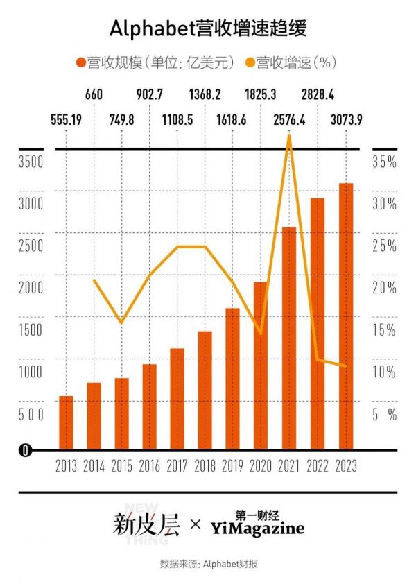 Alphabet也在尝试将生成式AI应用到搜索上。毕竟,搜索引擎对广告主的吸引力正在下降——过去的两年里,Google搜索引擎业务增速滑落至10%以下。2023年8月,Alphabet宣布推出生成式AI搜索平台SGE(Search Generative Experience),不过相比早在同年3月就将GPT-4部署在搜索引擎Bing上的微软,Alphabet慢了近半年。