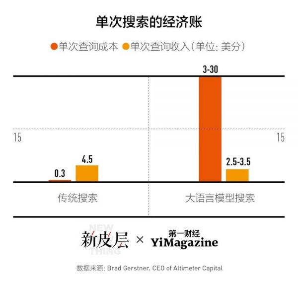 有数据显示,传统信息搜索的成本是0.3美分,收入则是4.5美分;基于大语言模型的搜索,成本介于3至30美分,收入却是2.5至3.5美分。因此,尽管大语言模型提供了更先进的查询处理能力,但从商业角度看,将其应用于搜索业务,可能只会拖营收的后腿。