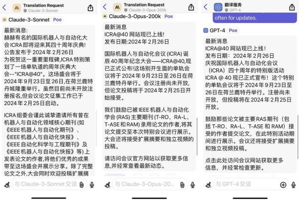 PS:适道在Poe上使用同样的提示语,让Opus、Sonnet、GPT-4 Turbo随机做了一段简单的新闻翻译。结果,Sonnet的表现居然最好,甚至翻译出了缩写!Opus水平巨中,而GPT-4直接忽略了主语。。