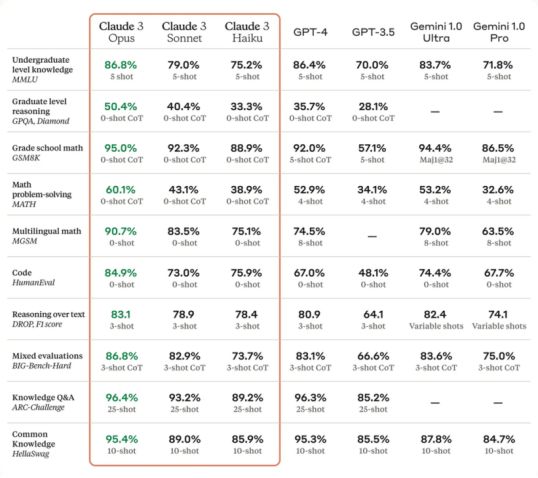 根据Anthropic公布的技术报告,Opus在知识测试MMLU、推理测试 GPQA、基础数学测试 GSM8K 等一系列基准测试中,均优于GPT-4。Sonnet的性能与GPT-4不相上下;Haiku则略逊于GPT-4。不过,这项测试中没有包含刚刚更新的GPT-4 Turbo和Gemini 1.5 Pro。