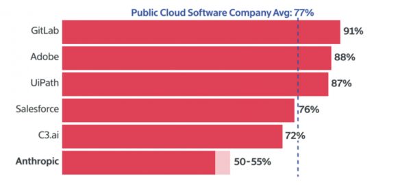但根据Information报道,有两位知情人士透露,在支付客户支持和AI服务器成本后,2023年12月Anthropic的毛利率在50%-55%。根据Meritech Capital的数据,这远低于云软件公司77%的平均毛利率。