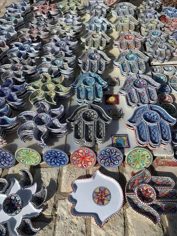 这两个国家的瓷器都非常漂亮,都有法蒂玛之手的主题。然而,突尼斯城的麦地那没有摩洛哥的商业化,这里还能看到当地人需要的各种杂货,譬如新郎送新娘的大小礼盒,小的装首饰,大的装睡衣。杂货店里卖个头很大的铁桶,看着很像中国大陆食堂的开水桶,桶的下部也有一个开关,一打听才知那是装食用油的桶。在橄榄收获季节,当地人会买一桶油,一直吃到来年。