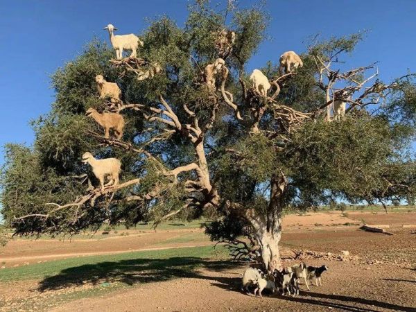 突尼斯全国种橄榄,橄榄花是国花。摩洛哥土地不肥沃,不那么适合种橄榄树,却有独特的摩洛哥坚果,也有独特的采摘方式。当地人把山羊赶到坚果树上,羊吃坚果肉,排泄出果仁。