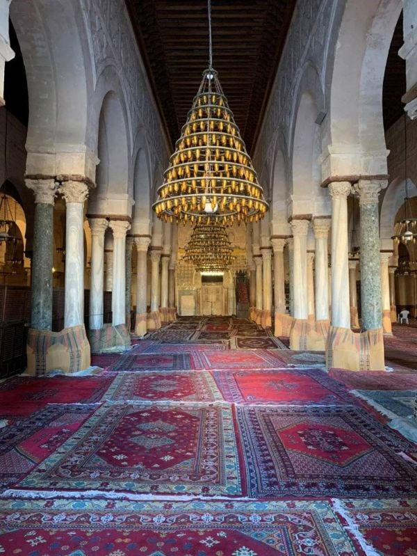 凯鲁万大清真寺高高耸立,但那厚实的围墙让我感觉它更像一座城堡。进入寺院旁的矮门,就是一片巨大的广场。广场上静寂无声,也没有清真寺广场常见的鸽群。寺内红地毯铺地,吊灯明亮,石柱宏伟,石柱的底部包着毯子,显然是为人靠坐而设,但此时空无一人。我们又走到与清真寺相连的宗教学校里,还是空无一人。当地人口20万,觉得这偌大的清真寺太过清净了。