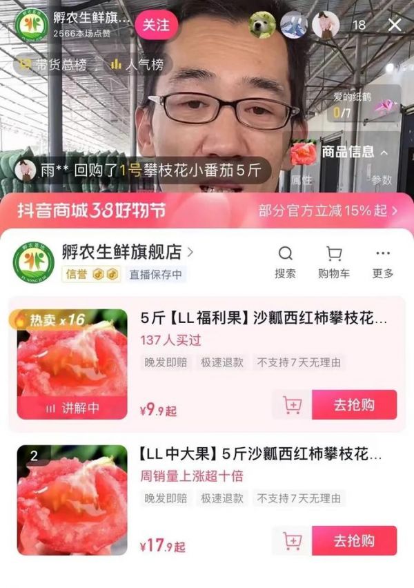 作为蜜香橙园的小号、新店铺,“孵农生鲜旗舰店”已经开始直播带货。3月7日,商家在直播中解释,因为是新店铺,每天只能上500库存,3月6日已经售完。直播间显示,其中一款产品“5斤西红柿中大果”已售327件,周销量上涨超10倍。