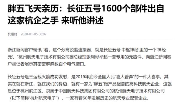 实际上,长征五号的零部件中,就有近1600个是来自同一家公司:杭州航天电子技术有限公司。
