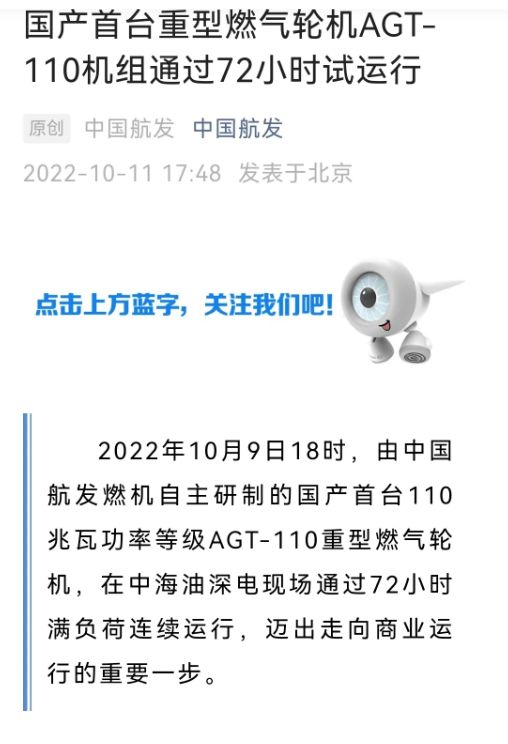 我记得以前也有个新闻,说是我国自主研制的重型燃气轮机成功了,这又是怎么回事呢?我查了下,是2022年10月9日我国的110MW AGT-110重型燃气轮机在中海油深圳电力完成了72小时试运行。