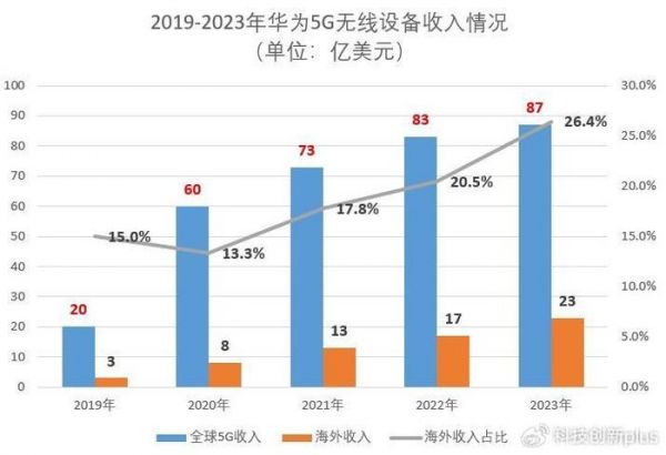 如下图所示,这是华为连续5年5G无线设备销售收入情况,有全球收入,海外市场收入,以及海外市场收入占比三项。