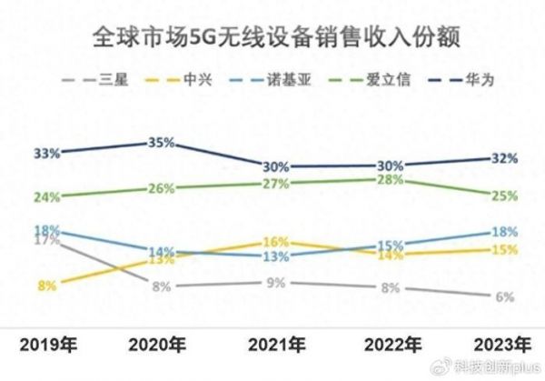 近日,知名机构Dell‘Oro发布了2019年至2023年,全球5大知名通信设备厂商,在5G无线设备市场的收入份额变化情况。