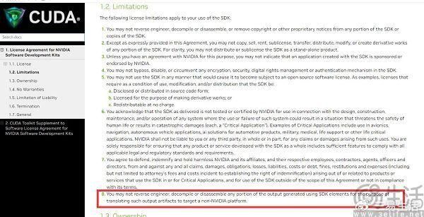 那么这一次的英伟达禁令,到底卡没卡国产GPU的脖子呢?事实的真相其实是有些大V过于危言耸听了。此次事件起于数周前,一位德国工程师Longhorn发现在安装CUDA 11.6时,英伟达在最终用户许可协议 (EULA) 的限制类目中增加了新的条款,“您不得对使用SDK元素生成的任何输出部分进行逆向工程、反编译或拆解,以将此类输出工件转换为目标非NVIDIA平台。”