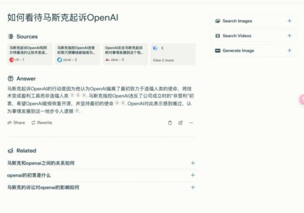 用户如果对Perplexity的回答不满意,也能让它重写,同时还会提供一些衍生话题的追问,比如:马斯克和OpenAI的关系如何?马斯克的诉讼对OpenAI的影响?
