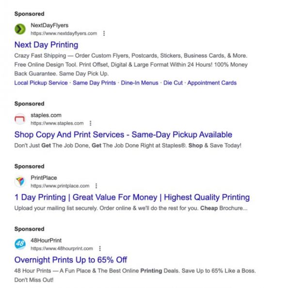 同样的问题去谷歌搜索,结果不出所料前4个都是广告赞助,而后是谷歌地图、Yelp排名、某个打印店官网、Reddit论坛等等各种杂烩。因此从Perplexity直观的界面对比来看,确实谷歌的回答需要用户花很长时间去甄别有效信息。