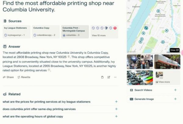 比如,当让Perplexity帮忙找哥伦比亚大学附近最实惠的打印店时,Perplexity很快提供了20个引用来源并筛选出6家门店。每家都尽可能附带了官网、地址和业务范围。